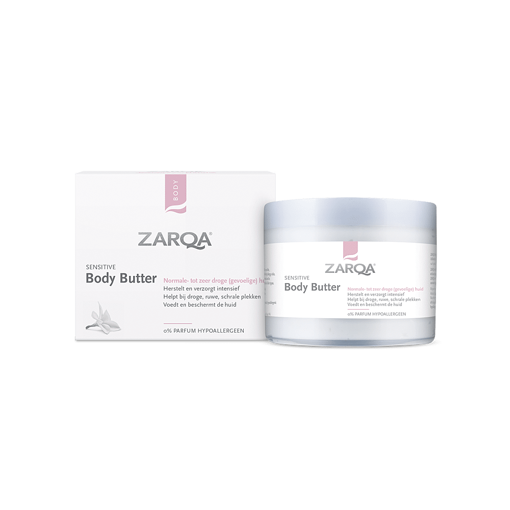 Kan je huid wat extra’s gebruiken? Verzorg ‘m met de intensief verzorgende en voedende ZARQA Body Butter, op basis van Dode Zeezout, -mineralen en shea butter. De rijke boter herstelt en kalmeert de (zeer) droge en gevoelige huid en voorkomt en bestrijdt kloofjes, schilfertjes en een ruwe huid. De huid voelt zacht, soepel en goed gehydrateerd aan, de hele dag door.