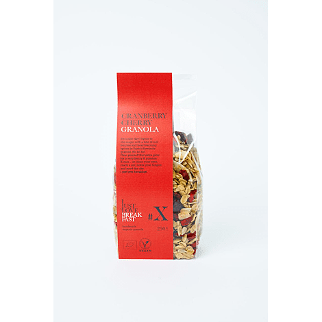 Deze granola bevat geroosterde havervlokken met gedroogde cranberries en kersen. De veenbessen en zure kersen geven de kerstspecial een fris accent terwijl de hartverwarmende kruiden de winter even doen vergeten.