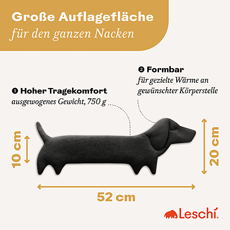 Maak kennis met Winston, de trouwe hond van Leschi die jouw metgezel wordt op koude dagen. Heb je last van stijve schouders, nekpijn, of ben je gewoon toe aan een moment van ontspanning? Winston staat kwispelend voor je klaar om je te verwarmen en te troosten. Je kunt hem eenvoudig opwarmen in de magnetron (2 minuten op 600W) of in de oven (15 minuten op 100°C). Vervolgens blijft dit zachte warmtekussen ongeveer 45 minuten heerlijk warm.
